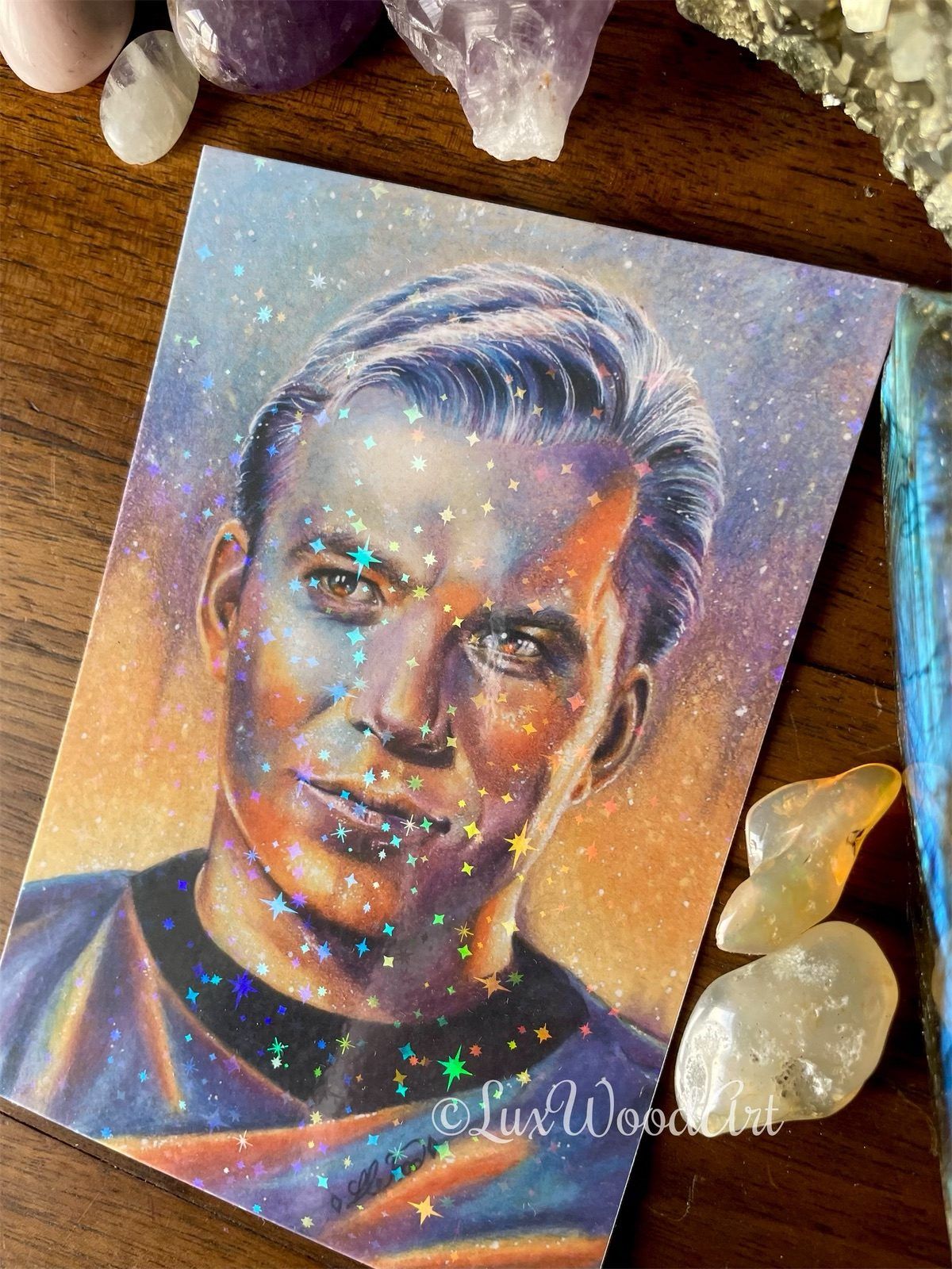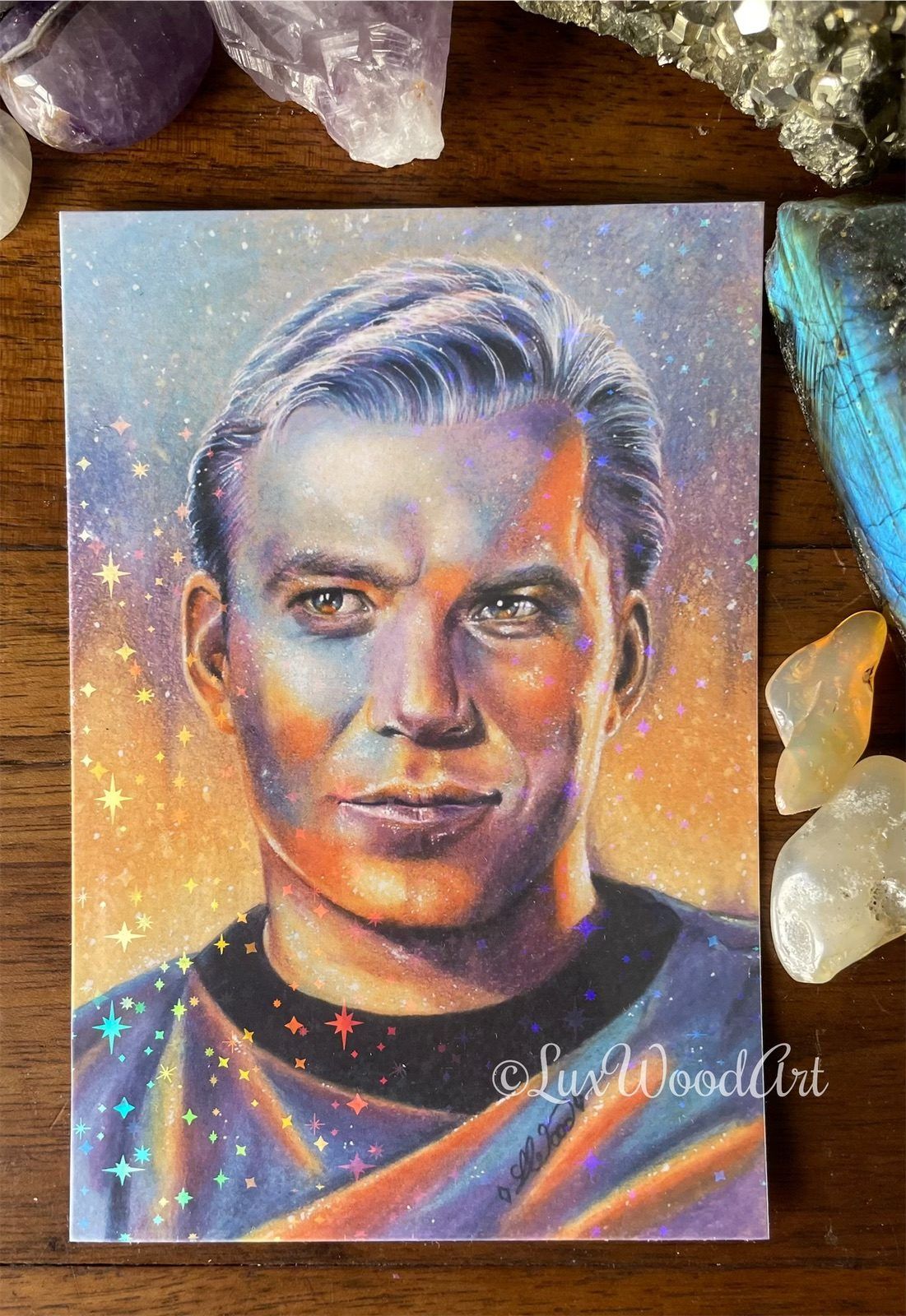 “Rainbow Kirk card”  is a collectible, showcasing a small print of my original portrait of Captain Kirk. Crafted on thick, high-quality paper with vibrant color inks, it boasts a stunning holographic starry finish, adding a touch of magic.