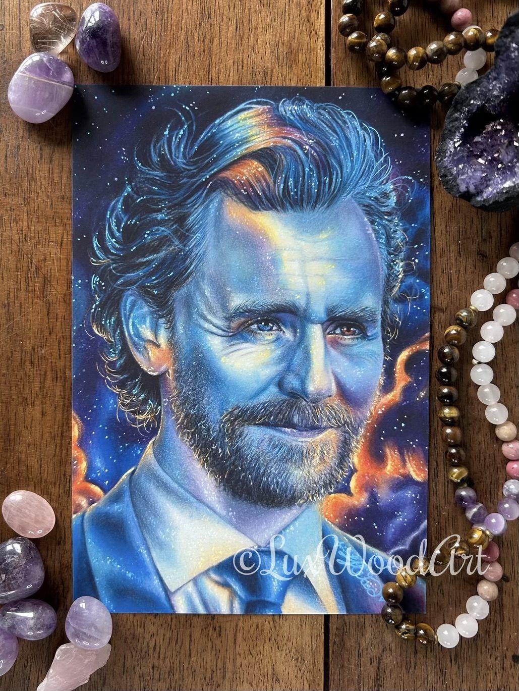 « Opalescent Tom » is an original color pencil portrait on Toned Tan paper. It captures the ethereal elegance of Tom Hiddleston. This portrait features opalescent colors, inspired by the magical and enchanting qualities of opal. As I envisioned this portrait, I saw Tom as a celestial being, radiating with an otherworldly aura.