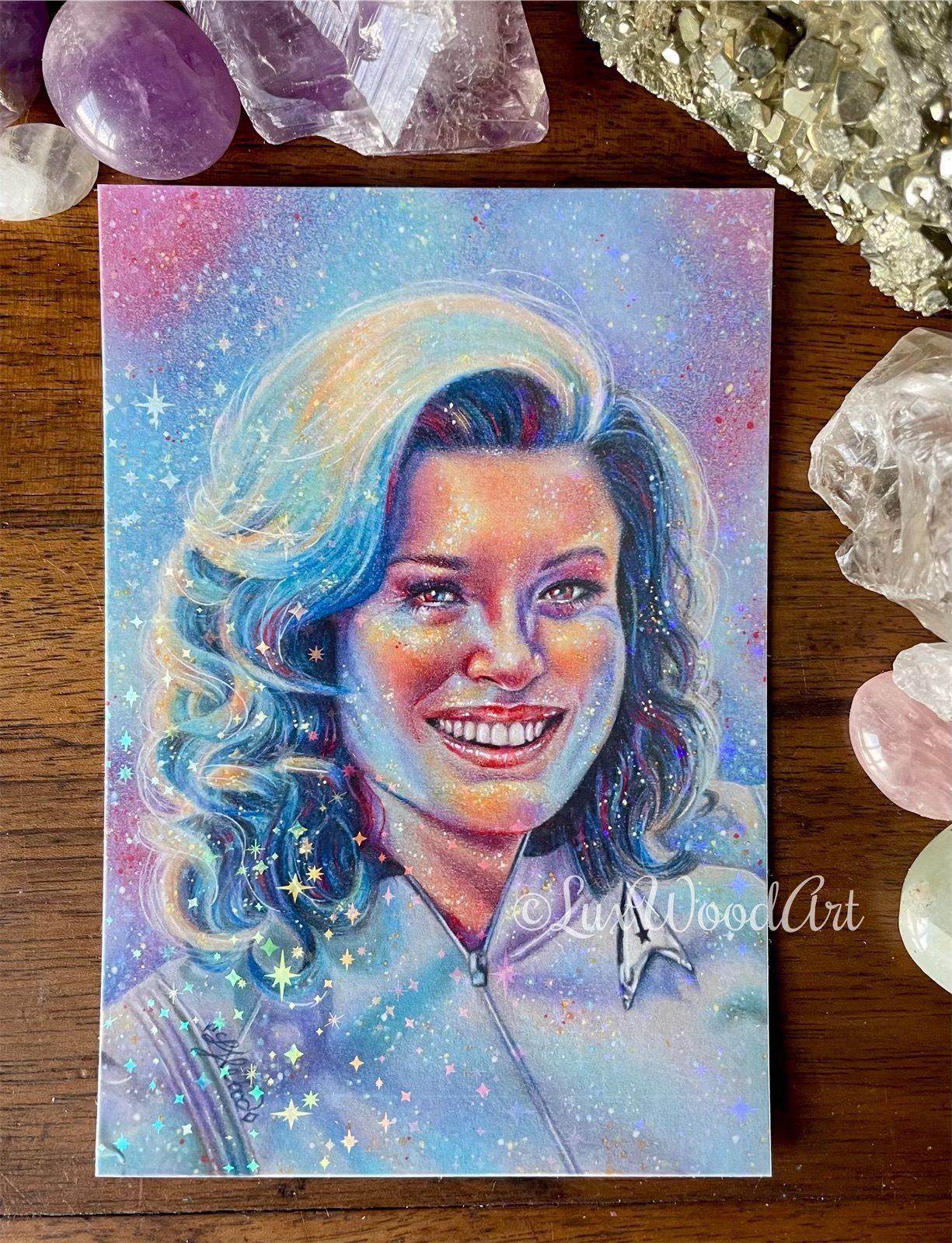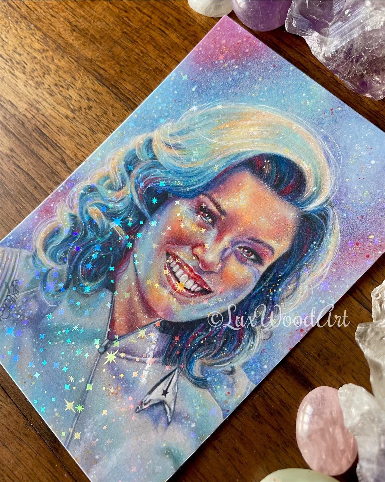 Crafted with rich, bright tones, the artwork transports viewers into a universe of endless possibilities. Additionally, myriad starlights adorn the background, adding depth and dimension to the portrait. Romijn’s portrayal as Number One is brought to life while showcasing her resilience and leadership qualities.